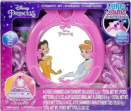 Disney Princess Light-Up Cosmetic Vanity Set – Safe Makeup Kit for Kids Ages 3+ with Lip Gloss, Eye & Cheek Shimmer, Brushes, Lights & Music